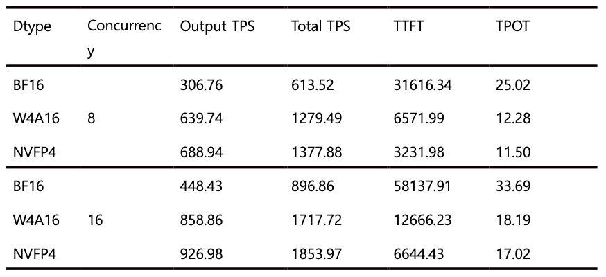 이 결과는 NVFP4의 가속 효과가 특히 긴 입력 구간에서 더 크게 나타날 수 있음을 시사합니다. 입력 길이가 길어질수록 프리필(prefill) 구간이 전체 연산에서 차지하는 비중이 커지는데, NVFP4는 이런 대규모 병렬 연산에서 더 높은 효율을 제공하기 때문에 TTFT 개선으로 이어졌을 가능성이 큽니다. 즉, NVFP4의 이점은 단순히 이론적인 비트 수 절감에 머무르지 않고, 실제 장문 입력 환경에서 체감 가능한 지연 시간 감소로 연결될 수 있다는 의미를 가집니다.