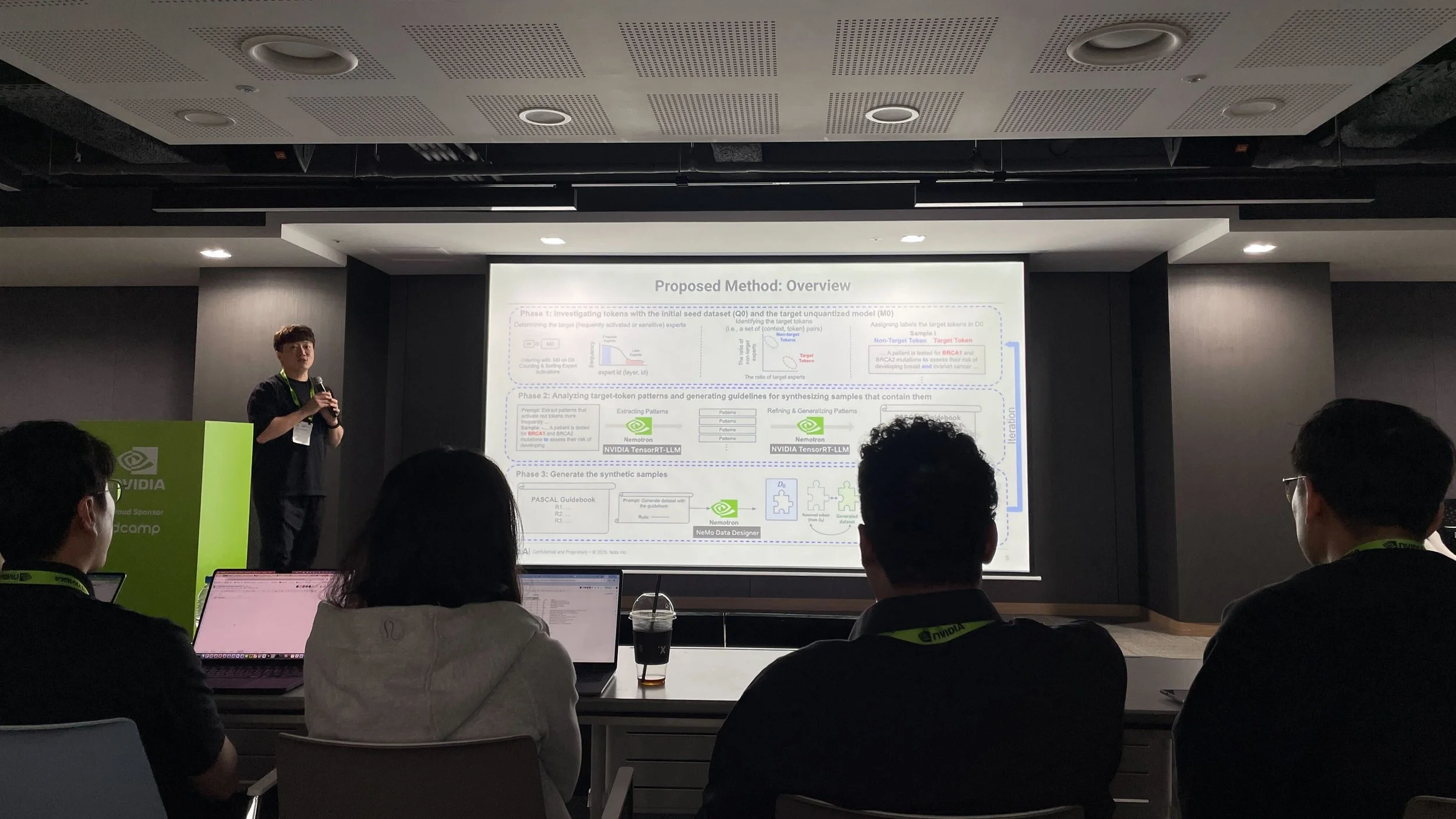박한철·김건민·이건호 세 사람이 무박 2일에 걸쳐 만든 결과물은 'MoE 양자화에 특화된 합성 데이터 생성 파이프라인'이라는 한 줄로 요약됩니다. 그러나 그 한 줄 뒤에는, 회의실과 숙소를 오가며 번갈아 잠들던 밤이 있었고, 세미나를 듣는 중에도 코드 버그를 발견해 부랴부랴 수정하던 장면이 있었고, 5분짜리 피치 안에 엔비디아와의 협업 미래까지 담아내려 했던 클로징 멘트가 있었습니다.