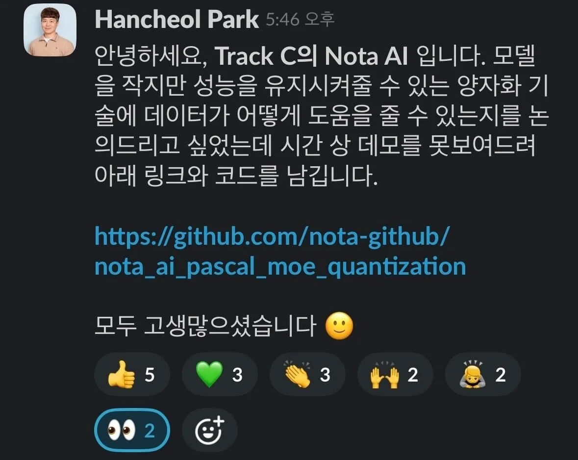 ※ 이 인터뷰는 무대 뒤의 이야기에 집중했습니다. 'MoE 양자화 + 합성 데이터'라는 기술 자체에 대한 풀이는 이곳 노타 테크블로그의 후속 글에서 이어집니다.